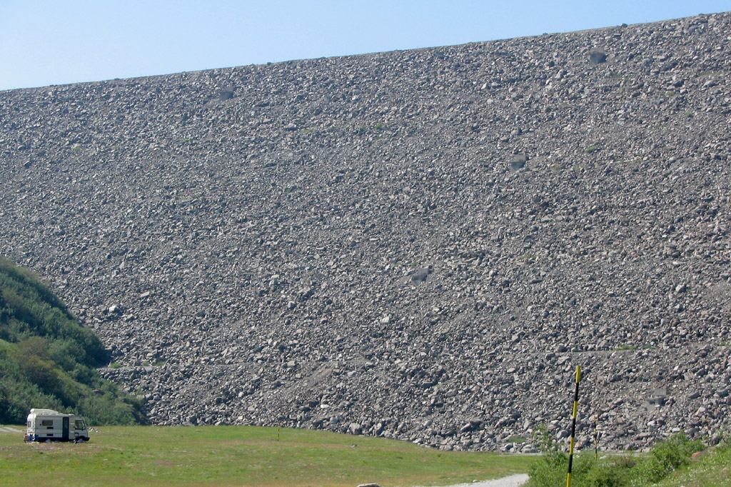Non, c'est seulement le Musée de la Pyramide du Col du Mont-Cenis que l'on peut voir quand on roule en direction du barrage. Les théoriciens du complot sont déçus, je sais... Voici encore un panoramique, seul format adapté à rendre justice à la taille imposante du lieu ! Quelques kilomètres plus loin, le barrage se montre sous un angle différent. Si vous doutez encore de la taille de l'édifice, regardez donc la hauteur du barrage sur la deuxième photo...
